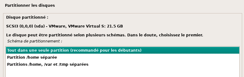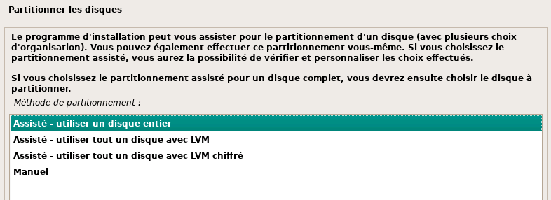 Assisté, utiliser un disque entier,Tout dans une seule partition, garder les options proposées, tout valider. Attention à prendre le bon disque ! (le plus gros en général)