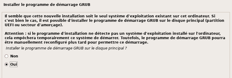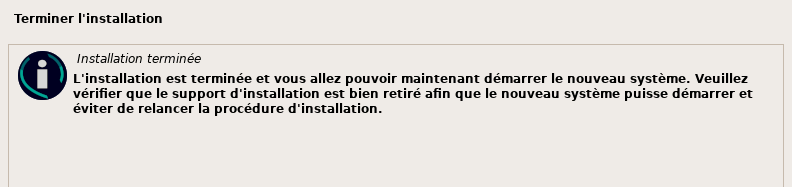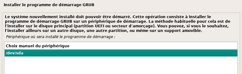 - Installer le bootloader (GRUB), faire attention au choix du disque