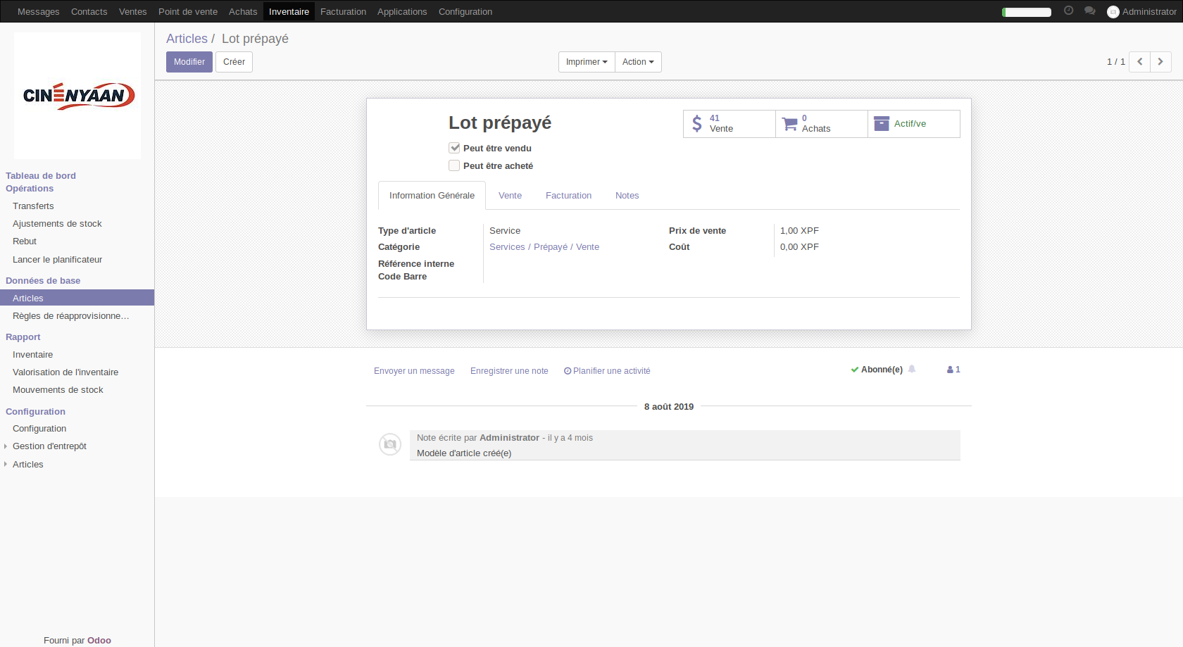 Accéder à l’article Lot prépayé (via ‘Inventaire’ -> ‘Articles’).