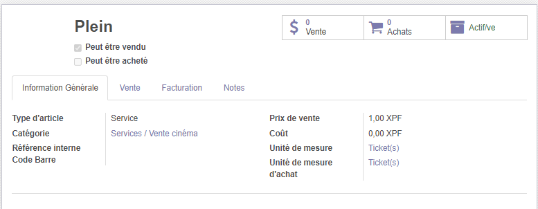 Paramétrages ODOO Produits système Tarifs Cinéma